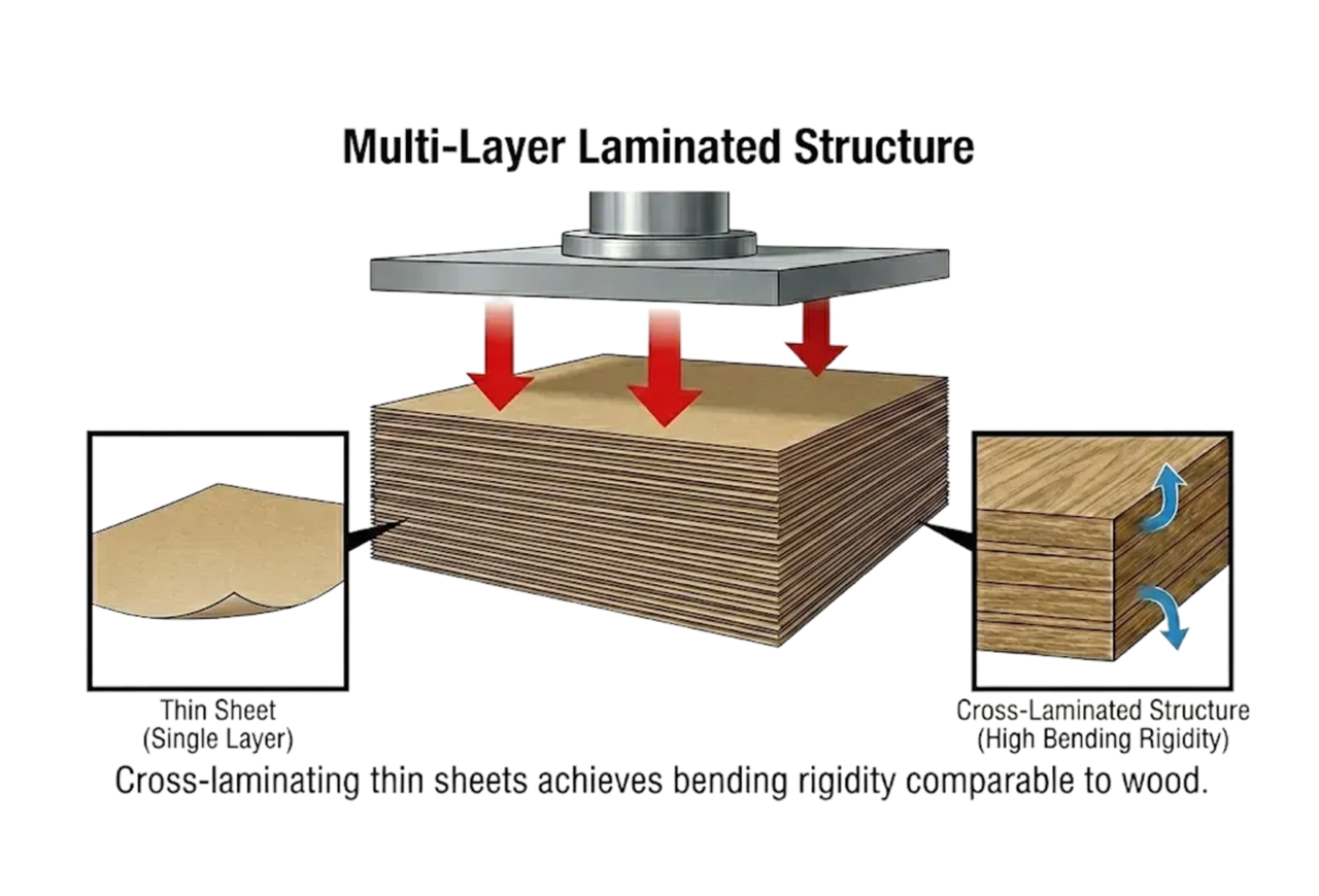 얇은 시트를 교차 적층하여 목재에 버금가는 휨 강성을 구현합니다.